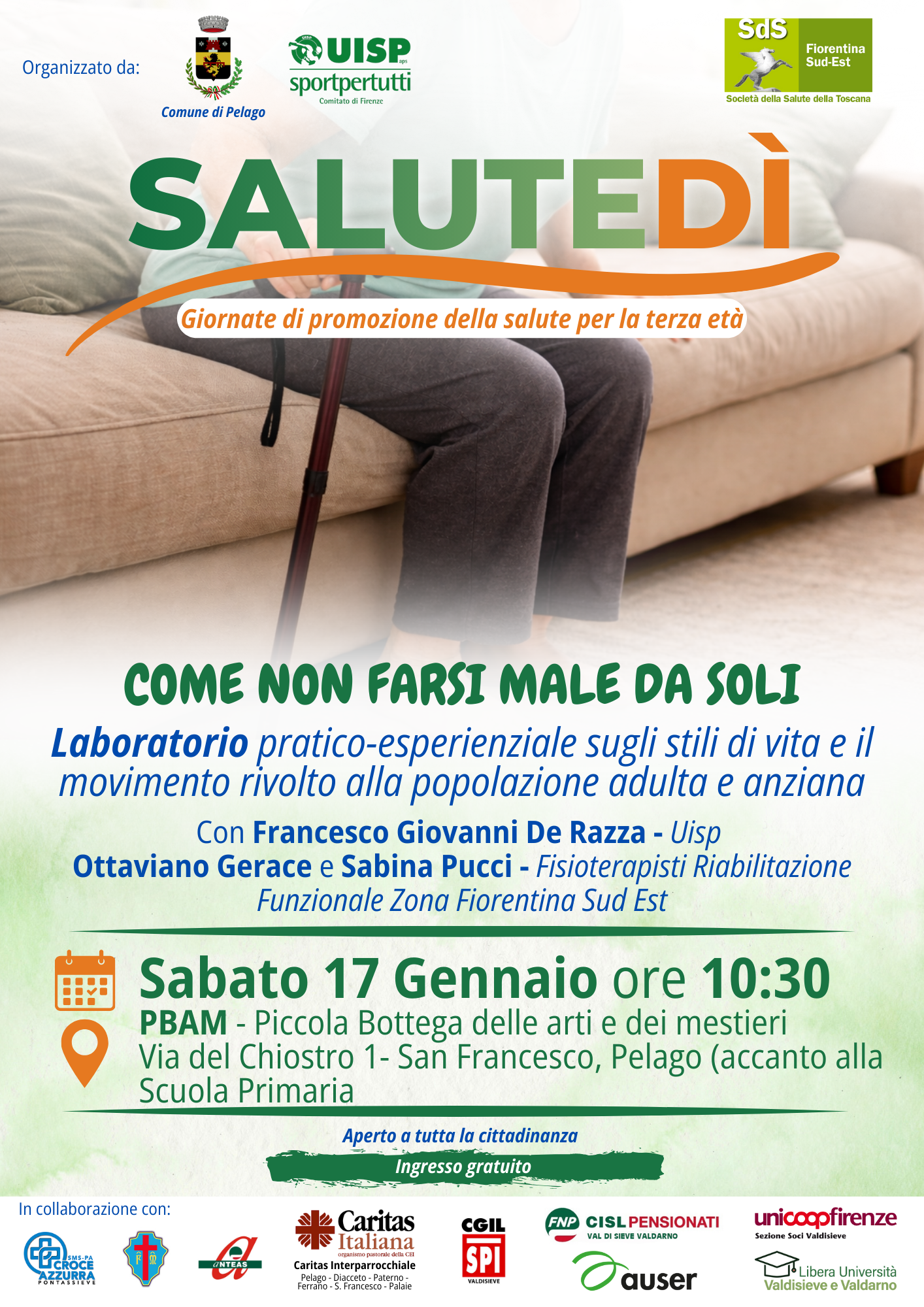 Il progetto SaluteDì – Giornate di promozione della salute per la terza età si fonda su un approccio di comunità e di rete, che mette al centro la persona e promuove il diritto alla salute attraverso proposte gratuite, accessibili e diffuse sul territorio, in collaborazione con le realtà associative e sanitarie locali: Croce Azzurra di Pontassieve, Misericordia di Pontassieve, Anteas Valdisieve, Caritas Interparrocchiale di Pelago, Diacceto, Paterno, Ferrano, S. Francesco e Palaie, SPI CGIL Valdisieve, FNP CISL PENSIONATI Val di Sieve Valdarno, Auser Pontassieve, Sezione Soci Coop Valdisieve e LUVV - Libera Università Valdisieve e Valdarno.