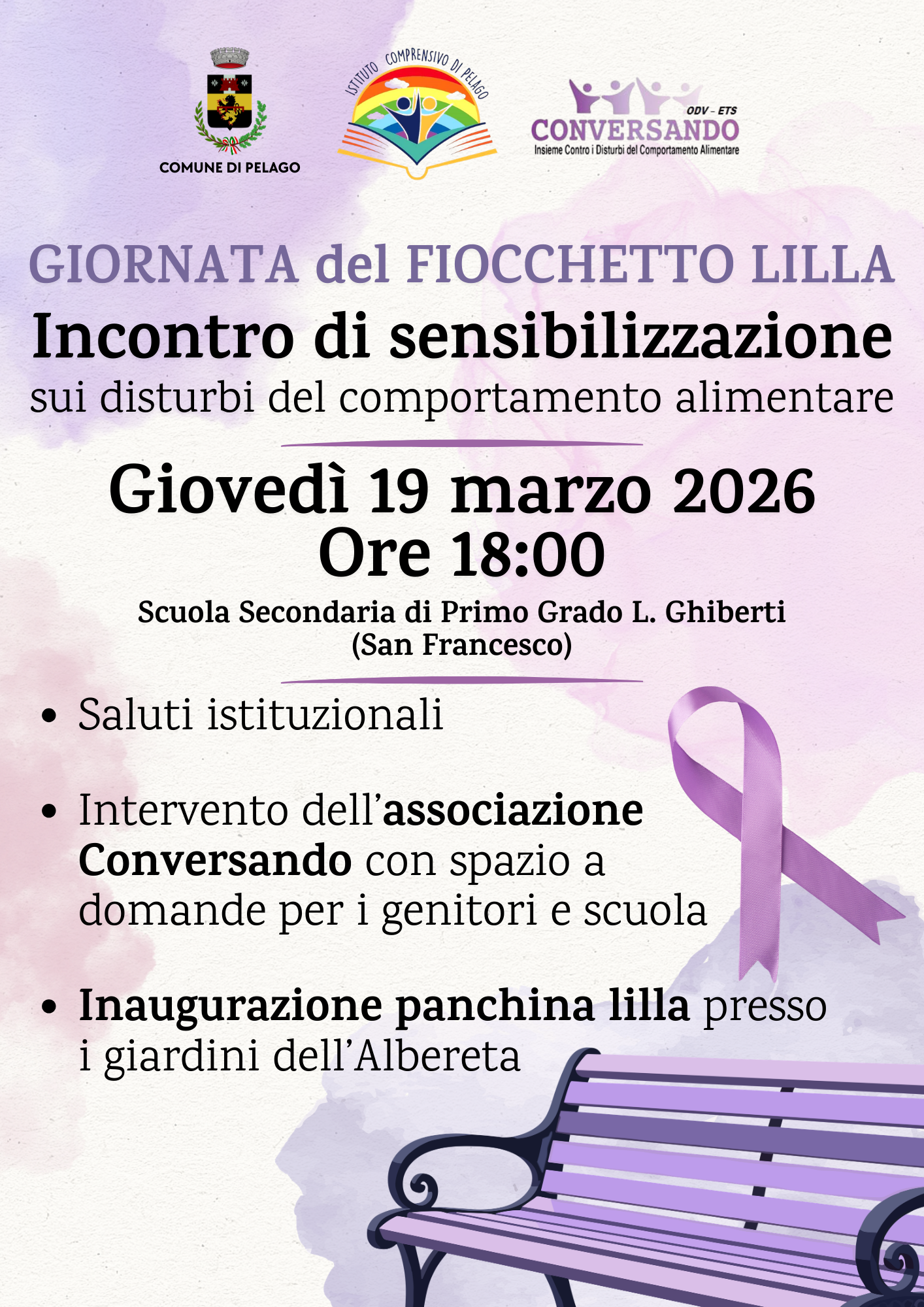 Il Comune di Pelago, l’Istituto Comprensivo di Pelago e l’associazione Conversando ODV-ETS promuovono un incontro pubblico di sensibilizzazione sui disturbi del comportamento alimentare in occasione della Giornata Nazionale del Fiocchetto Lilla, ricorrenza dedicata alla prevenzione, all’informazione e al sostegno delle persone e delle famiglie che affrontano queste patologie.
