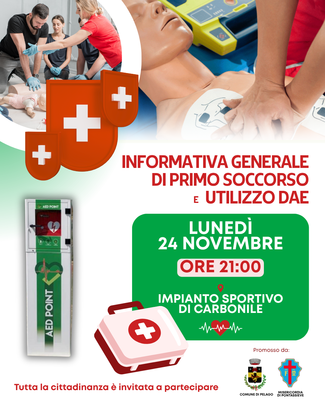 Il Comune di Pelago e la Misericordia di Pontassieve promuovono un incontro pubblico dedicato al primo soccorso e all’utilizzo del defibrillatore semiautomatico (DAE), in programma lunedì 24 novembre alle ore 21:00 presso l’impianto sportivo di Carbonile. L’iniziativa, aperta a tutta la cittadinanza, ha l’obiettivo di diffondere conoscenze di base sulle manovre salvavita e di sensibilizzare la comunità sull’importanza di un intervento tempestivo in caso di emergenza cardiaca.
