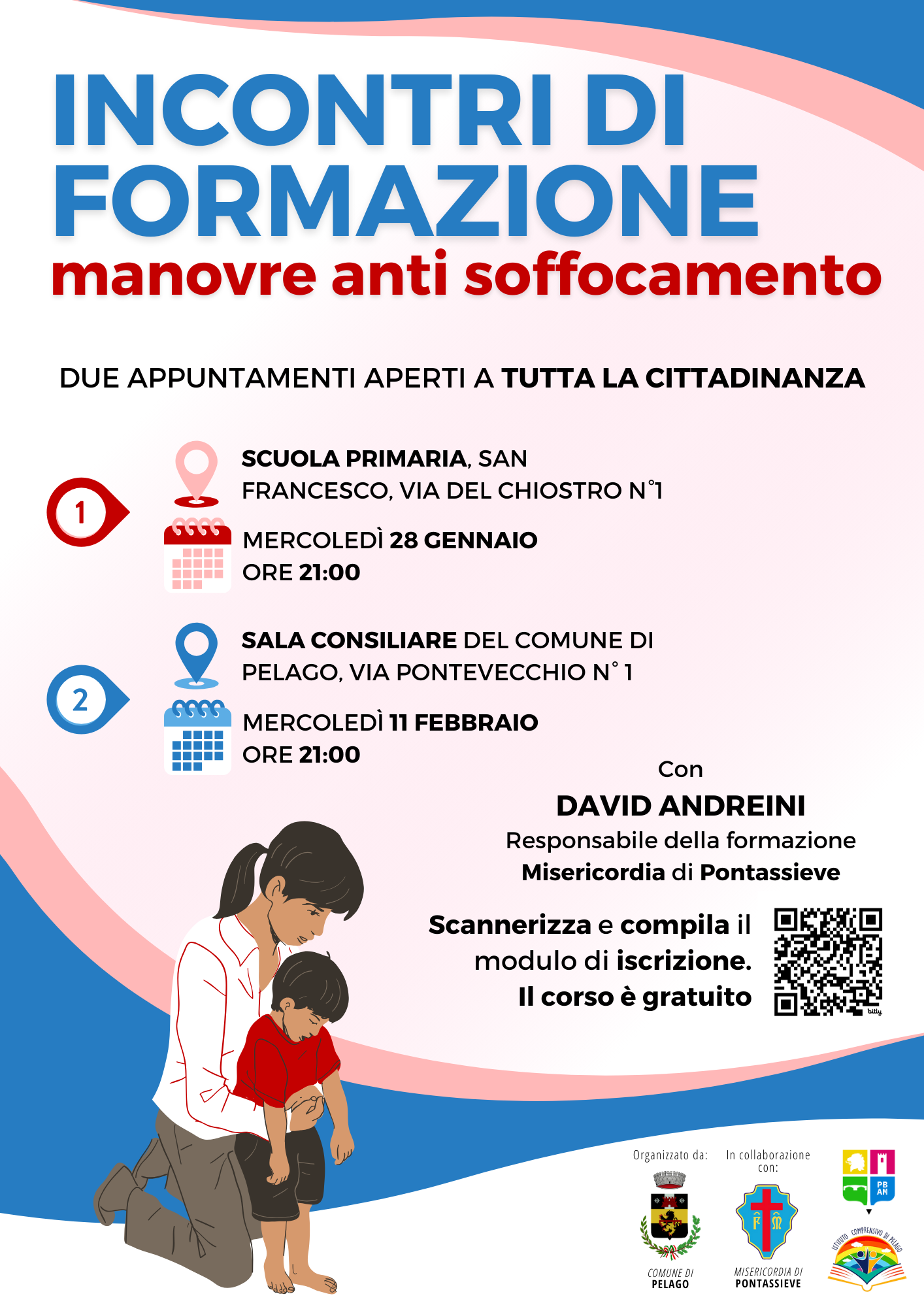Il Comune di Pelago organizza, in collaborazione con la Misericordia di Pontassieve e l'Istituto Comprensivo di Pelago, due incontri di formazione dedicati alle manovre di disostruzione delle vie aeree e alla conoscenza del sistema di emergenza NUE 112, con l’obiettivo di diffondere competenze fondamentali di primo soccorso e promuovere una maggiore consapevolezza sui comportamenti da adottare in situazioni di emergenza.