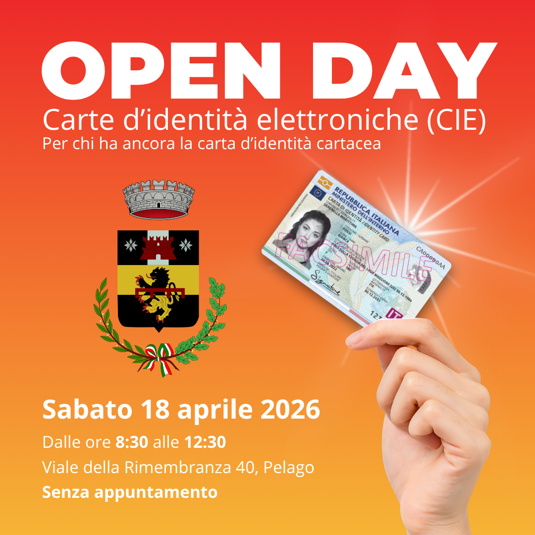 Il Comune di Pelago informa che sabato 18 aprile 2026, dalle ore 8.30 alle ore 12.30, è prevista un'ulteriore apertura straordinaria dell’Ufficio Anagrafe presso la sede di Viale della Rimembranza 40, dedicata al rilascio della Carta d’Identità Elettronica (CIE).