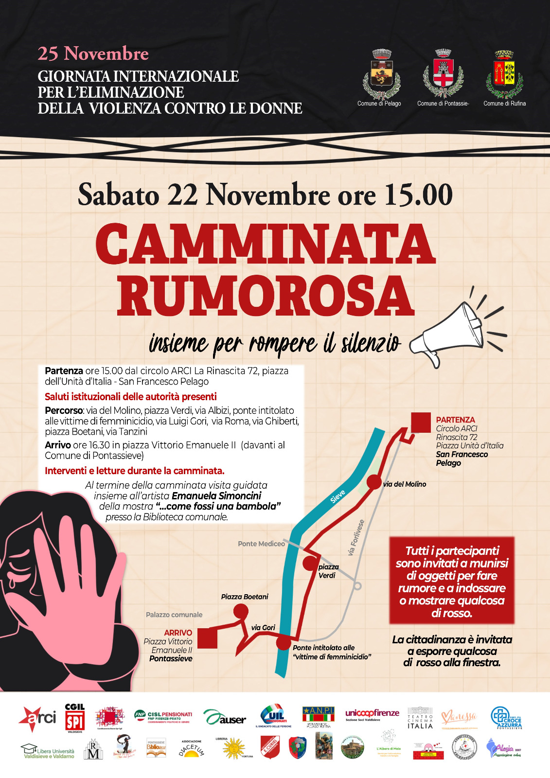 Con partenza alle ore 15:00 presso il Circolo Arci La Rinascita 72 a San Francesco, ed arrivo in Piazza Vittorio Emanuele II davanti al Comune di Pontassieve - passando dal ponte nuovo, intitolato alle vittime di femminicidio - la marcia sarà un'importante occasione per fare rumore e dar voce tramite letture ed interventi alle donne vittime di violenza.