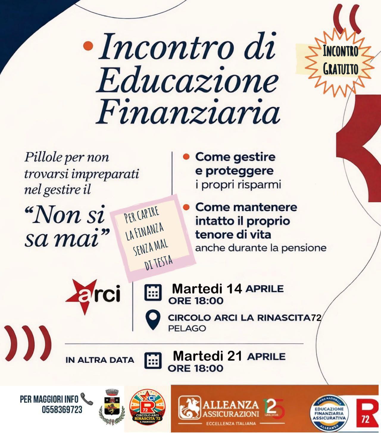 L’iniziativa, patrocinata dal Comune di Pelago, nasce dalla volontà di supportare in particolare lavoratori e pensionati nell’orientarsi tra le diverse possibilità di gestione e investimento dei risparmi, offrendo indicazioni pratiche per riconoscere situazioni potenzialmente rischiose ed evitare scelte che potrebbero rivelarsi dannose.