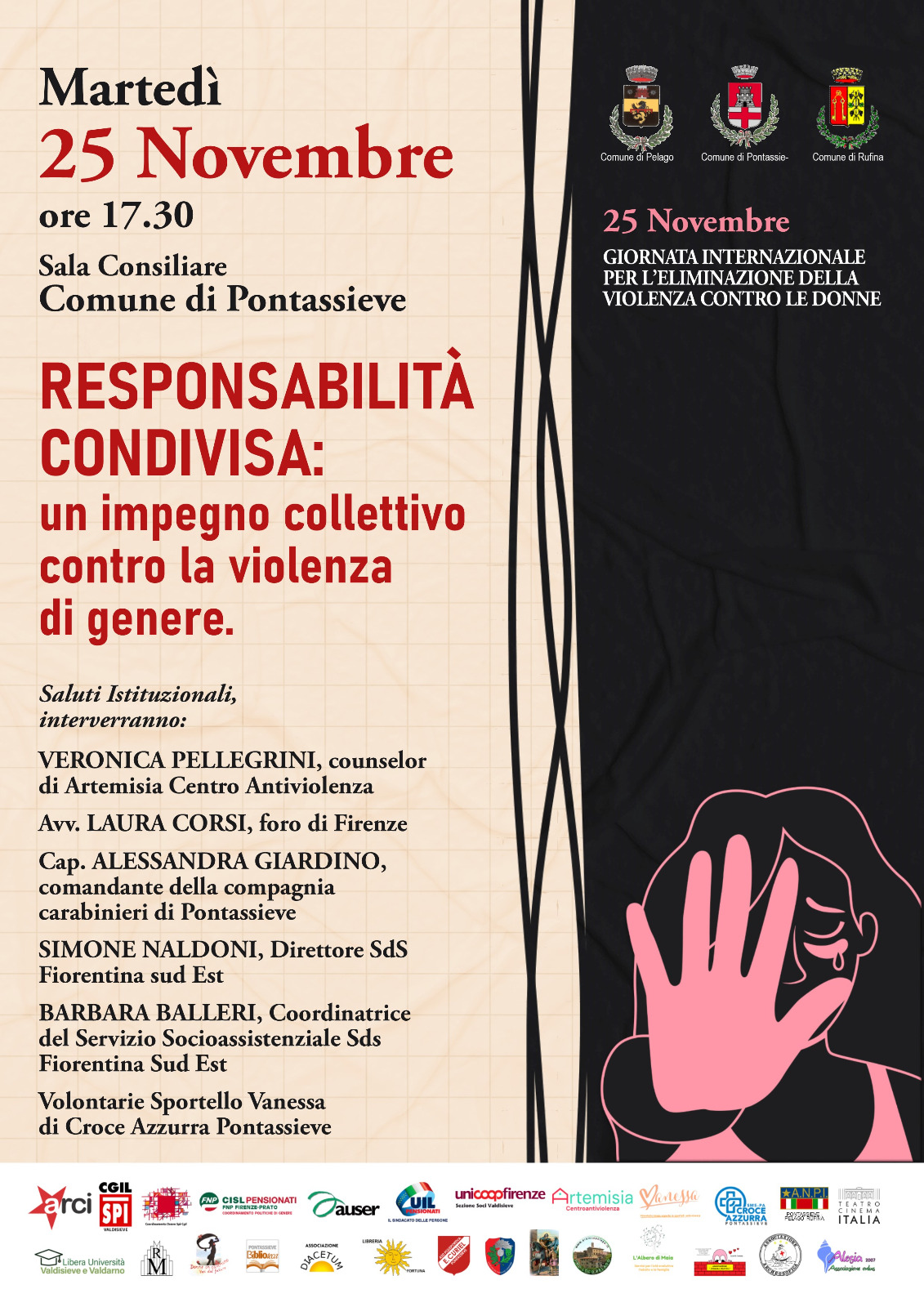 In occasione della Giornata Internazionale per l'eliminazione della violenza contro le Donne, l'amministrazione comunale di Pontassieve, in collaborazione con i Comuni di Pelago e Rufina e numerose associazioni del territorio, promuove l'incontro pubblico dal titolo "Responsabilità Condivisa: un impegno collettivo contro la violenza di genere". L'evento si terrà martedì 25 novembre alle ore 17.30, presso la Sala Consiliare del Comune di Pontassieve, con l'obiettivo di sottolineare l'importanza dell'azione congiunta delle istituzioni e della società civile nel contrasto al fenomeno.
